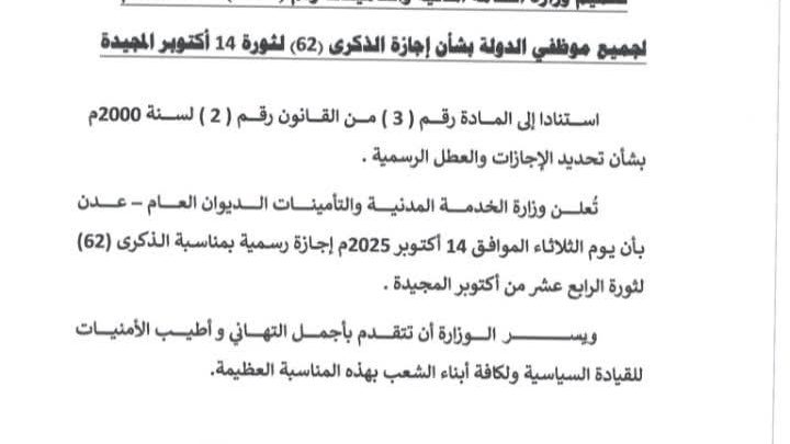 الخدمة المدنية تعلن الثلاثاء القادم إجازة رسمية بمناسبة الذكرى 62 لثورة 14 أكتوبر المجيدة