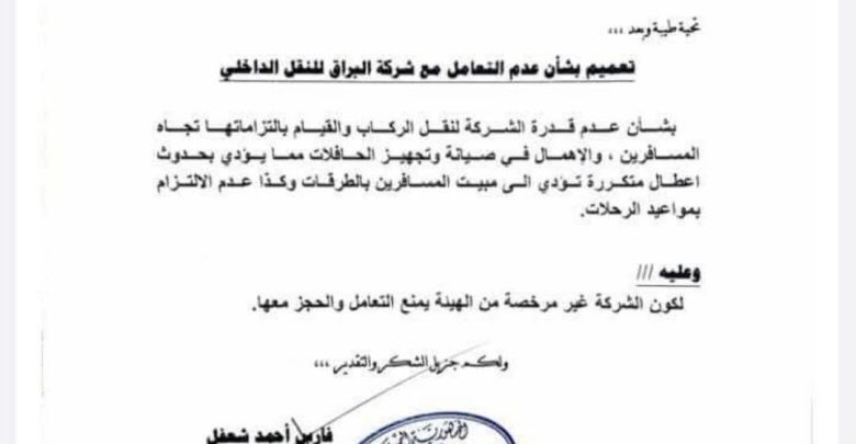وجاء في التعميم : تعميم بشان عدم التعامل مع شركة البراق للنقل الداخلي.