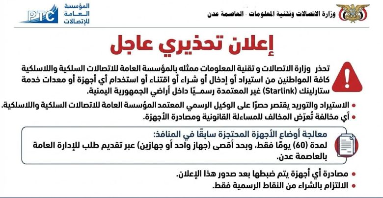 حذّرت وزارة الاتصالات وتقنية المعلومات، ممثلةً بالمؤسسة العامة للاتصالات السلكية واللاسلكية، كافة المواطنين من استيراد أو إدخال أو شراء أو اقتناء أو استخدام أي أجهزة أو معدات خاصة بخدمة ستارلينك (Starlink) غير المعتمدة رسميًا داخل أراضي الجمهورية اليمنية.