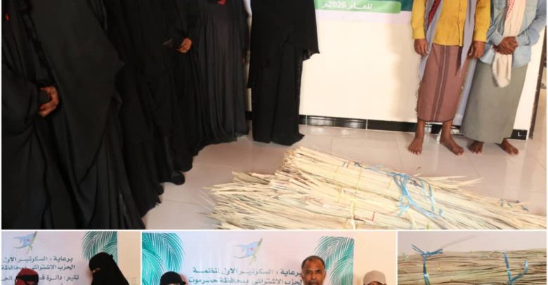 دشّنت دائرة قطاع المرأة في الحزب الاشتراكي بمديرية الريدة وقصيعر، صباح اليوم، برنامج دعم النساء في قطاع الصناعات الحرفية من سعف النخيل للعام 2026م، من خلال تدشين توزيع حزم من سعف النخيل مع توابعها، وذلك برعاية الأستاذ محمد عبدالله الحامد سكرتير منظمة الحزب الاشتراكي بمحافظة حضرموت.
