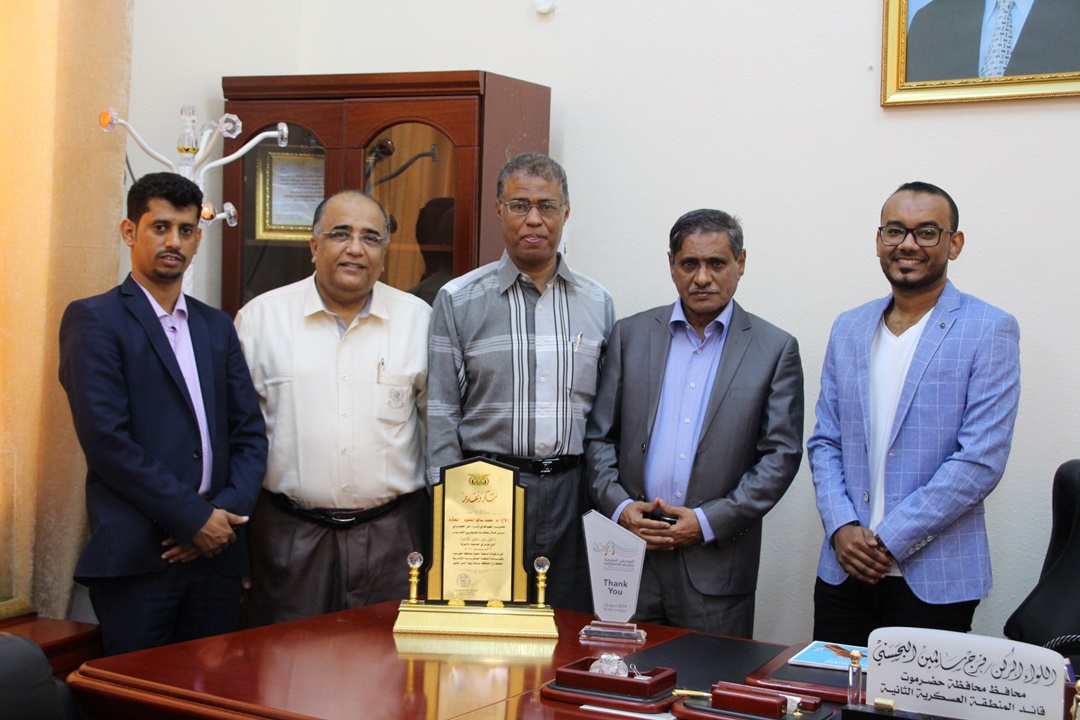 بدوره أهدى المؤلف محمد القحوم ، السيد المحافظ درعاً تذكارياً لفعالية الأوركسترا الحضرمية عرفاناً لدعمه للمشروع ومساهمته في انجاح الفعالية العالمية ، معرباً شكره وتقديره بإسمه ونيابة عن فريق العمل لمحافظ حضرموت لتكريمه ودعمه للمبدعين من الشباب في شتى المجالات .