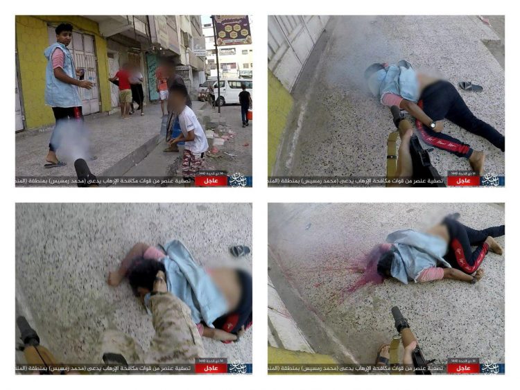 نشر موقع يحمل اسم “وكالة اعماق الاخبارية” صورا متعددة لعملية اغتيال جندي في العاصمة عدن مساء امس الخميس , ووفقاً للموقع المذكور فقد تبنى تنظيم “داعش” الارهابي عملية الاغتيال.