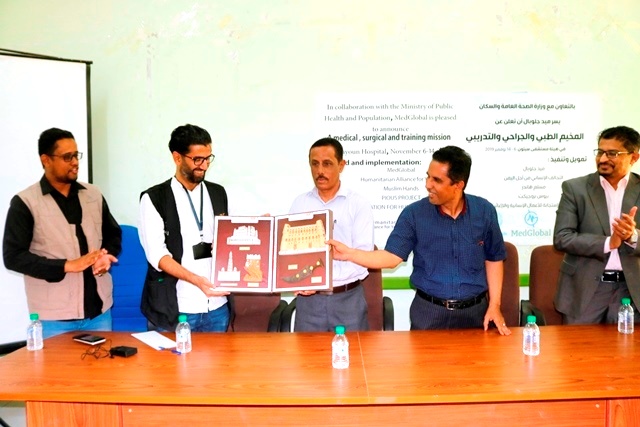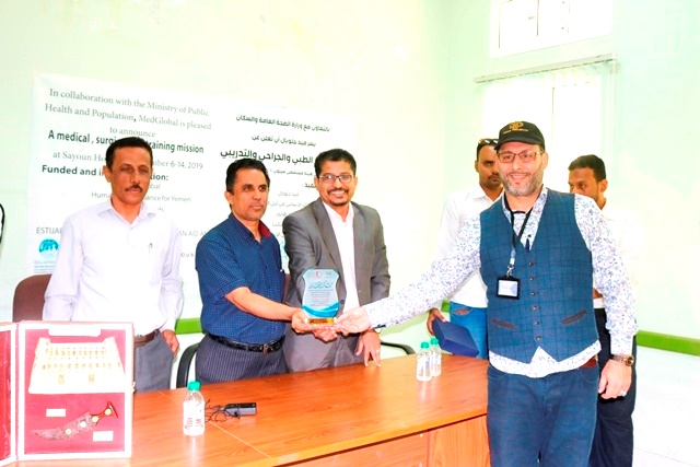 اختتم بهيئة مستشفى سيئون العام المخيّم الطبي والجراحي والتدريبي التي اقامته مؤسسة ميد جلوبال الامريكية بالتنسيق مع وزارة الصحة العامة والسكان بتمويل وتنفيذ ( ميد جلوبال , التحالف الانساني من اجل اليمن , مسلم هاندز , بيوس بروجيكت , مؤسسة استجابة للأعمال الانسانية والاغاثية ) الذي اقيم للفترة من 6 – 14 نوفمبر 2019 م بالتعاون مع هيئة مستشفى