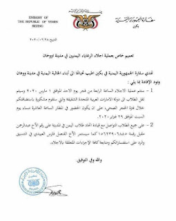 وحسب المصدر فاته تم اجلاء 58 يمني من الصين عند الساعة 4:00 فجرا مضيفا انه تم نقلهم الى الامارات وان البقية سيتم نقلهم قريبا.