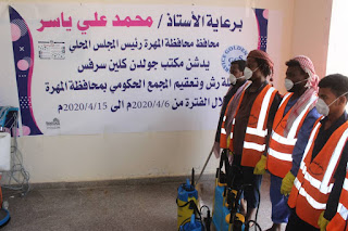 دشن محافظة محافظة المهرة، الأستاذ محمد علي ياسر، اليوم، بديوان المحافظة حملة الرش والتعقيم لمكاتب المجمع الحكومي التي ينفذها مكتب جولدن كلين سرفس.. ضمن الإجراءات الاحترازية لمنع تفسي فايروس كورونا.