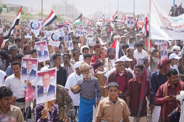 وحمل المتظاهرون اعلام اليمن مرددين شعارات ثورية دعت لتوحيد الجهود نحو البناء والتنمية موكدين تمسكهم بخيار الدولة والشرعية ممثلة بفخامة الرئيس هادي