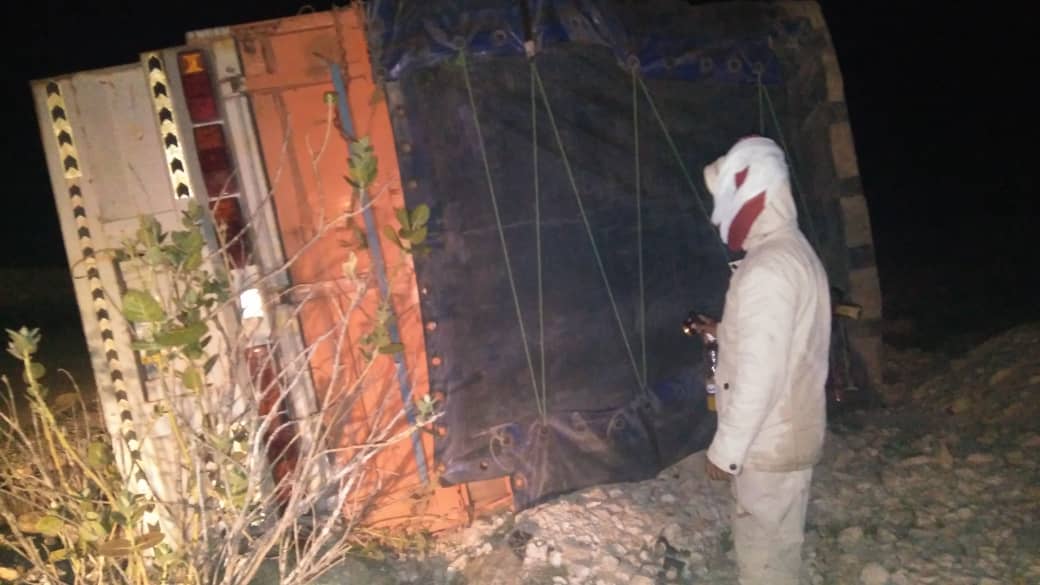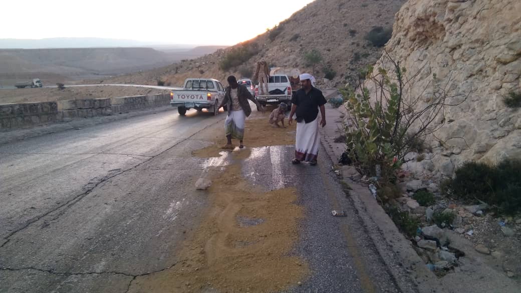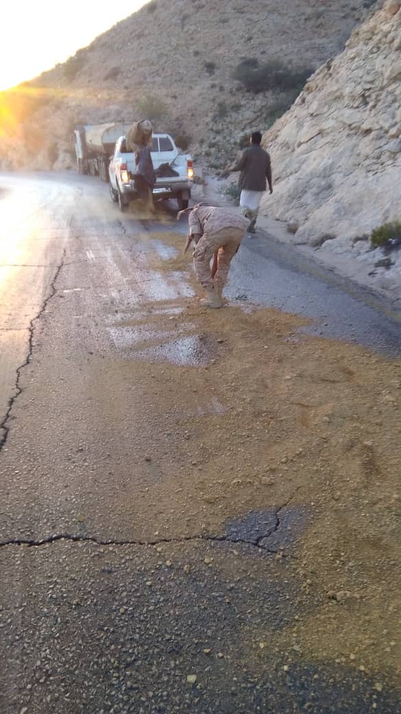 _من احد المواطنين يخبر بانقلاب قاطرة محمله قادمة الى المكلا تسبب انقلابها بتسرب زيت حارق من قاطرة قد تم توقيفها سابقا في نقطة لادواس وقد بذل الجنود الجهد الكافي في تغطية الزيت المسكوب ع الخط بالرمل ولكن قدر الله ماشاء فعل_