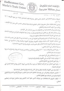 نقابات عمال حضرموت تدعو للاضراب عن العمل يومي الاثنين والثلاثاء “وثائق”