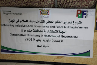 كما استعرض بعد ذلك منسق المحافظة لمشروع تعزيز الحكم المحلي وبناء السلام الشامل في اليمن المهندس أحمد باشراحيل أعمال وبرامج اللجنة خلال العام الحالي 2019م ومنها مشروع تعزيز الحكم المحلي وبناء السلام الشامل في اليمن الذي يعمل على تعزيز قدرات السلطة المحلية من خلال تشكيل لجنة استشارية من مختلف الاطياف في حضرموت تعمل على ايجاد تدخلات لحل النزاعات والصراعات واختيار المشاريع التنموية التي تنفذها على مستوى المديريات عبر الوكالة الالمانية للتنمية (GIZ) الشريك المحلي بالمشروع مع منظمة بيرجهوف الالمانية والشريك في اليمن منتدى التنمية السياسية بتمويل من الخارجية الالمانية.