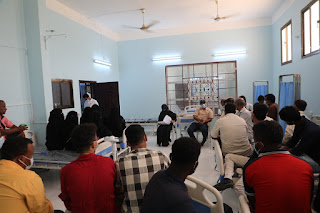 ناقش وكيل وزارة الصحة العامة والسكان مدير مكتب صحة ساحل حضرموت الدكتور رياض حبور الجريري اليوم بالطاقم الطبي والفني والإداري بمستشفى الحميات ( فلك) ومركز معالج حالات كورونا ( Covid-19 ) الترتيبات النهائية لافتتاح المستشفى والوقوف على أبرز المهام المناطة بكل طاقم وآلية العمل التي ستتم في المستشفى ، مستعرضا الدليل الإرشادي الصحي لوزارة الصحة العامة والسكان وبروتوكولات العلاج والعناية التمريضية بمرضى فيروس كورونا .